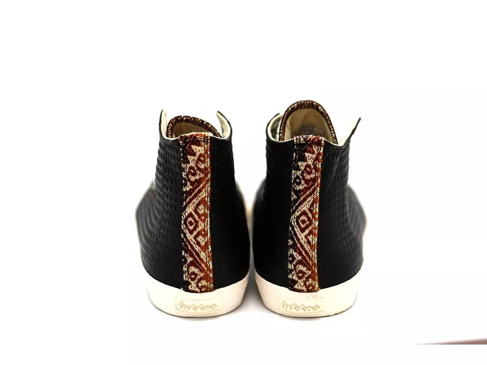 Elegantní vysoké tenisky, ideální do chladnějších dnů. Vnější materiál tvoří vysoce kvalitní kůže v zajímavém reliéfu, který tvoří jedinečný efekt, připomínající strukturu dřeva. Podrážka je vyrobena z kvalitní gumy, kdy spodní část odráží filosofii celé značky – část světa na pravé a část na levé noze připomíná hlavní myšlenku značky Inkkas, a sice spojovat svět dohromady. Decentní peruánská textilie na zadní části dodává jiskru celkovému vzhledu bot.