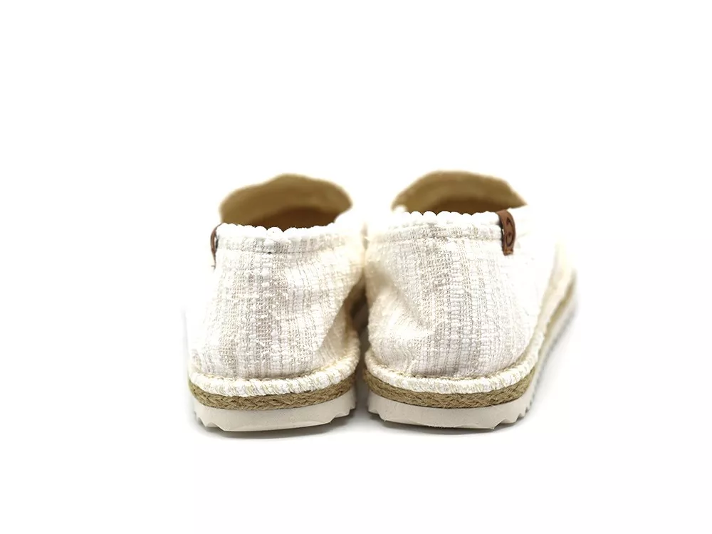 Minimalistické espadrilky v bílé barvě jsou ideálním letním doplňkem vašeho botníku. Bavlněná textilie zajistí prodyšnost o pohodlí se postará odolná podrážka z nárazy tlumící EVA pěny. Na první pohled nenápadné detaily, zdobení po vrchním okraji bot a jutová podrážka, dotváří celkový vzhled botiček.