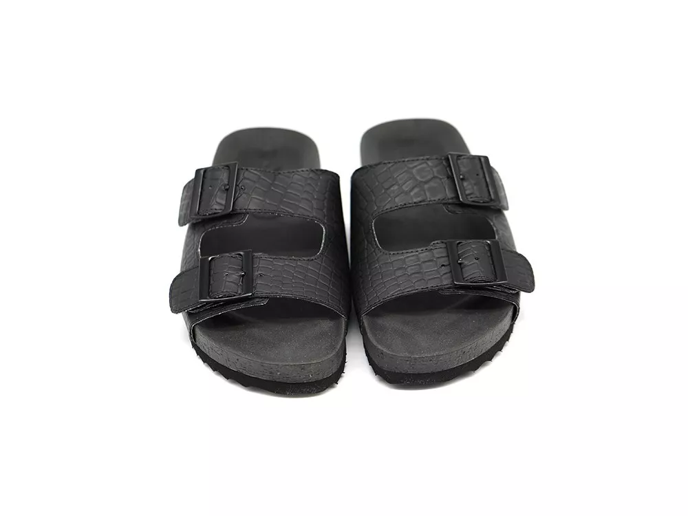 Dámské černé pantofle na přezky užijete do města či jako pohodlné přezůvky. Lehkost a pohodlí zajišťuje anatomická stélka z expandovaného PVC a podešev tvoří nárazy tlumící a odolná EVA pěna. Svršek tvoří imitace kůže černé barvy. Díky použitým syntetickým materiálům jsou pantofle veganské.